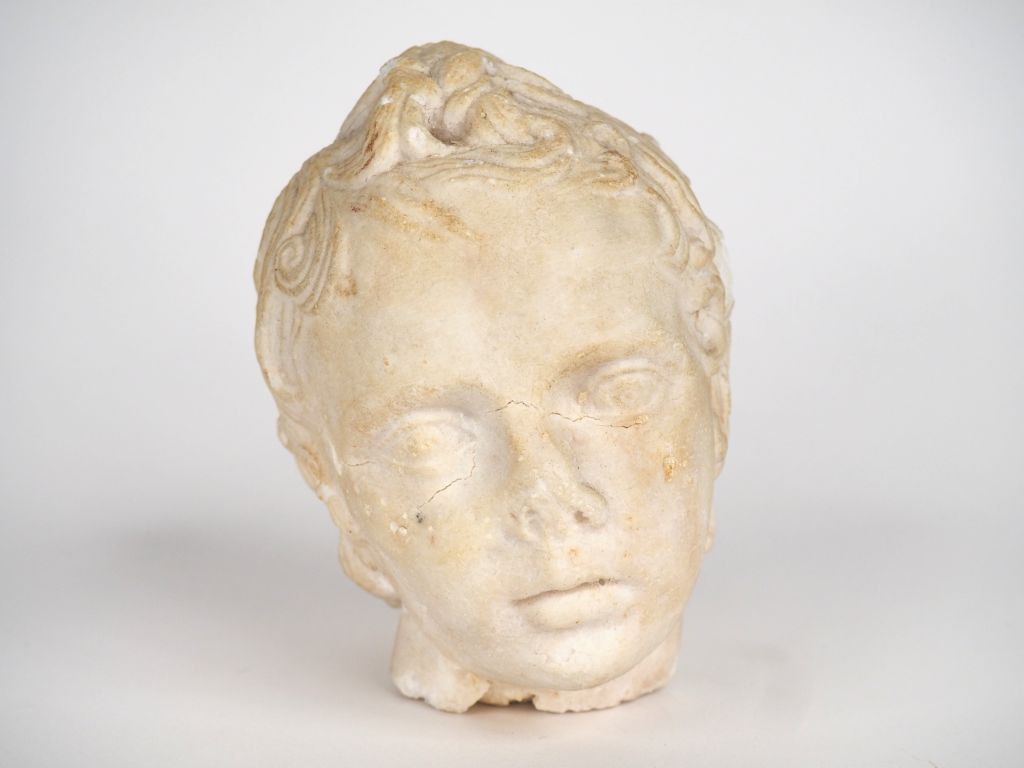 Tête début Xxème dans le goût de l'antique en marbre reconstitué. H. 14 cm. (Accidents). Expert : Jean-Sylvain Caillou, EI.