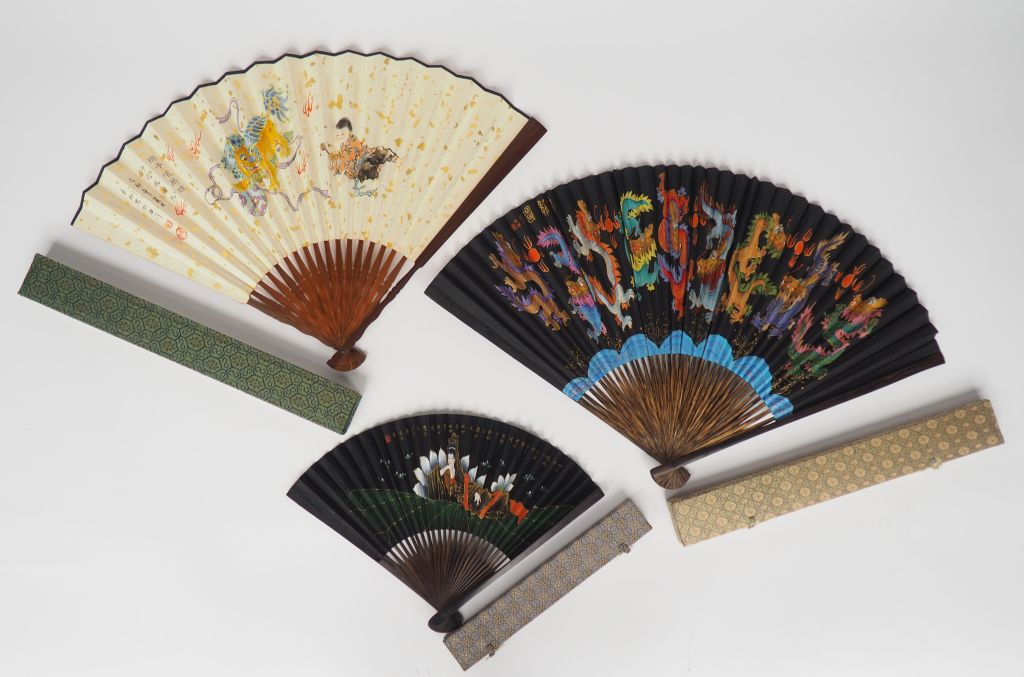 Trois différents éventails moderne de style extrême-orient. Dans leur coffret. L. de 20 à 30 cm.
