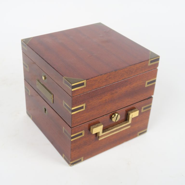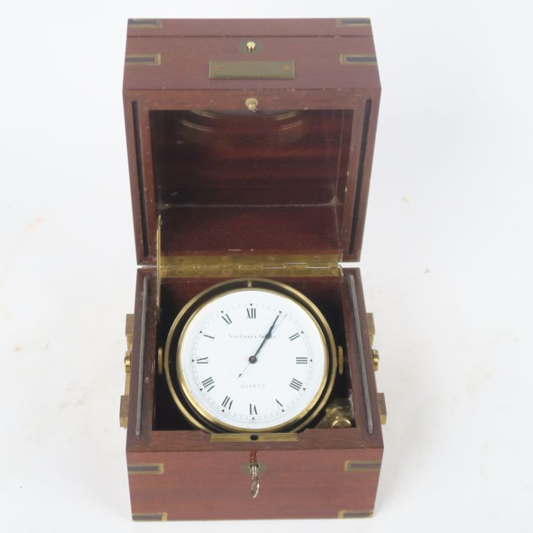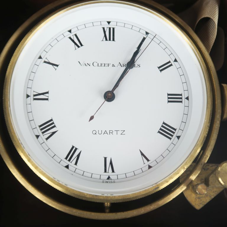 VAN CLEEF ARPELS. Chronomètre de marine en laiton, dans son coffret en acajou. Signé. Dim. 14,5 x 15 x 15 cm.