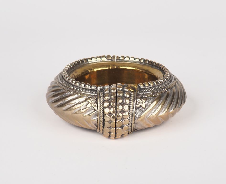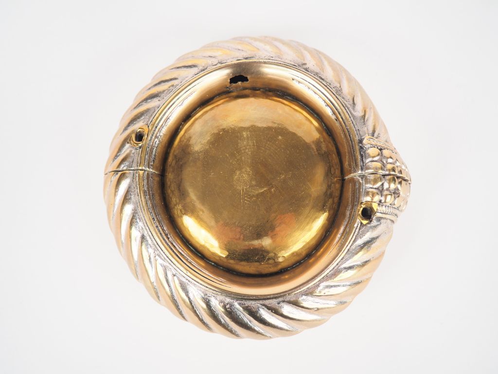 Vide-poche en bronze argenté et laiton à décor de côtes torses et de frises de perles. Diam. 14 cm. (percé sous la base).
