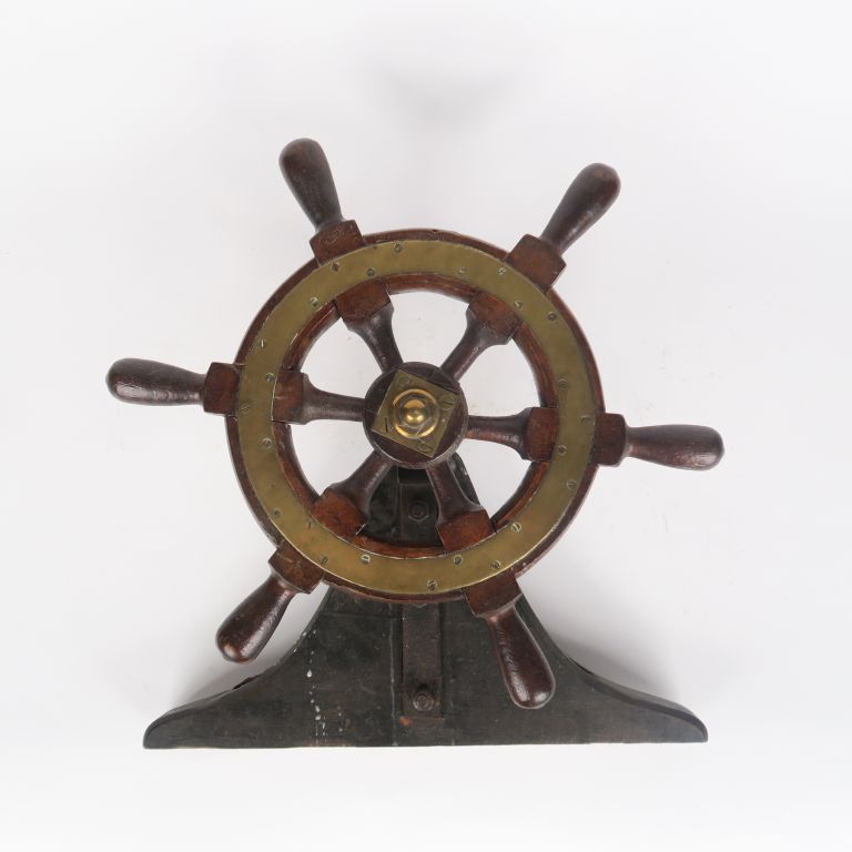 Lot de Barre de marine en chêne et laiton. Diam. De la roue : 46 cm au prix de 100 à 150 € en vente aux enchères par l'hôtel des ventes Primardeco