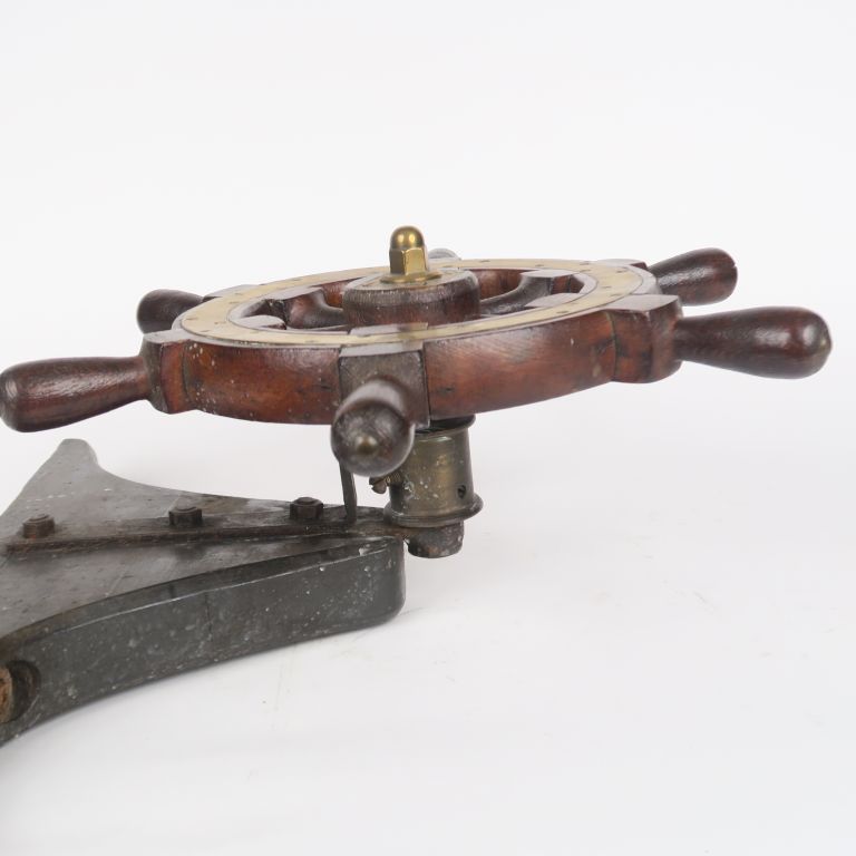 Barre de marine en chêne et laiton. Diam. De la roue : 46 cm