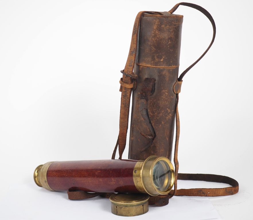 Longue-vue XIXème en bois et laiton à trois tirages, signée "SOLEIL, opticien du roi, Galerie Vivienne N°23 à Paris". Avec sa sacoche en cuir. L. 70 cm.