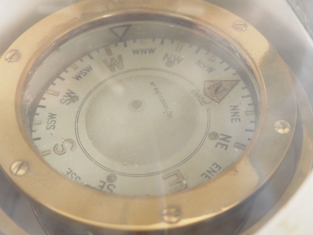 SESTREL. Boussole de marine dans son écrin en laiton. Signée. H. 30 cm.