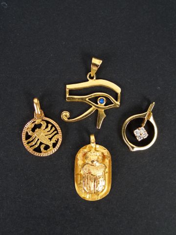 3 pendentifs en or jaune 14 et 9K. On y joint un pendentif en métal doré et 4 diamants de 0,01cts. Poids tel: 7,3gr