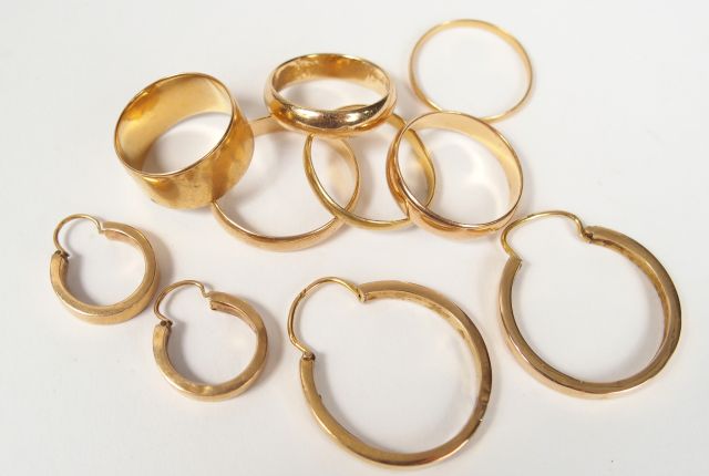 5 alliances en or jaune et 2 paires de créoles en or jaune. Poids: 21gr
