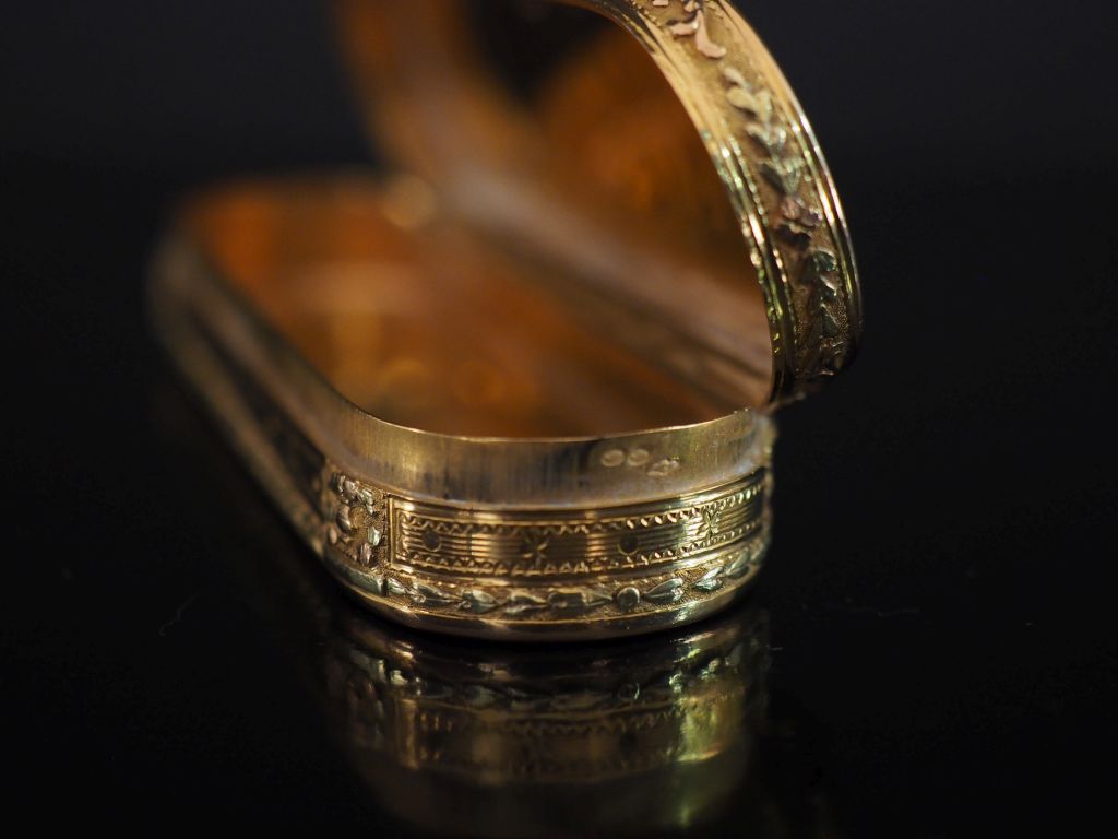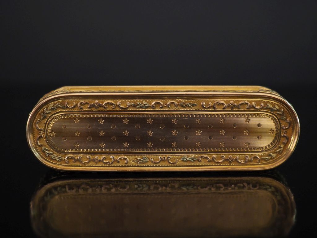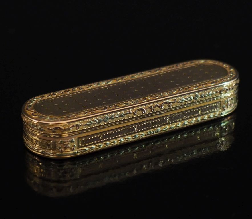 Boite à bords arrondis Louis XVI en or 750, à décor de semi de pois et de fleurettes au centre, rinceaux et feuillages en bordures. 1,6 x 9,5 x 1,5 cm Poids. 61,28 g (traces de poinçon XVIIIème)