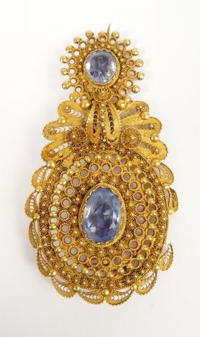 Broche fin XIXème en or jaune 14K, décor finement ajouré d'arabesques, de frises de fleurs et de perles d'or, rehaussé de 2 pierres bleues (manque). Dim. : 7,5 x 4cm Poids tel: 17,4gr