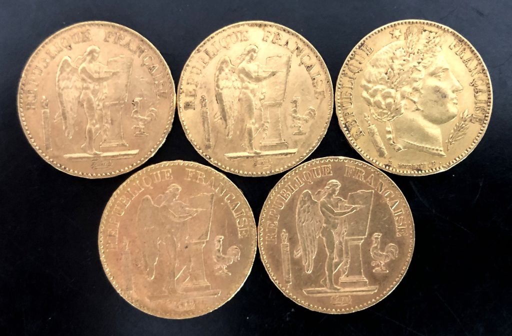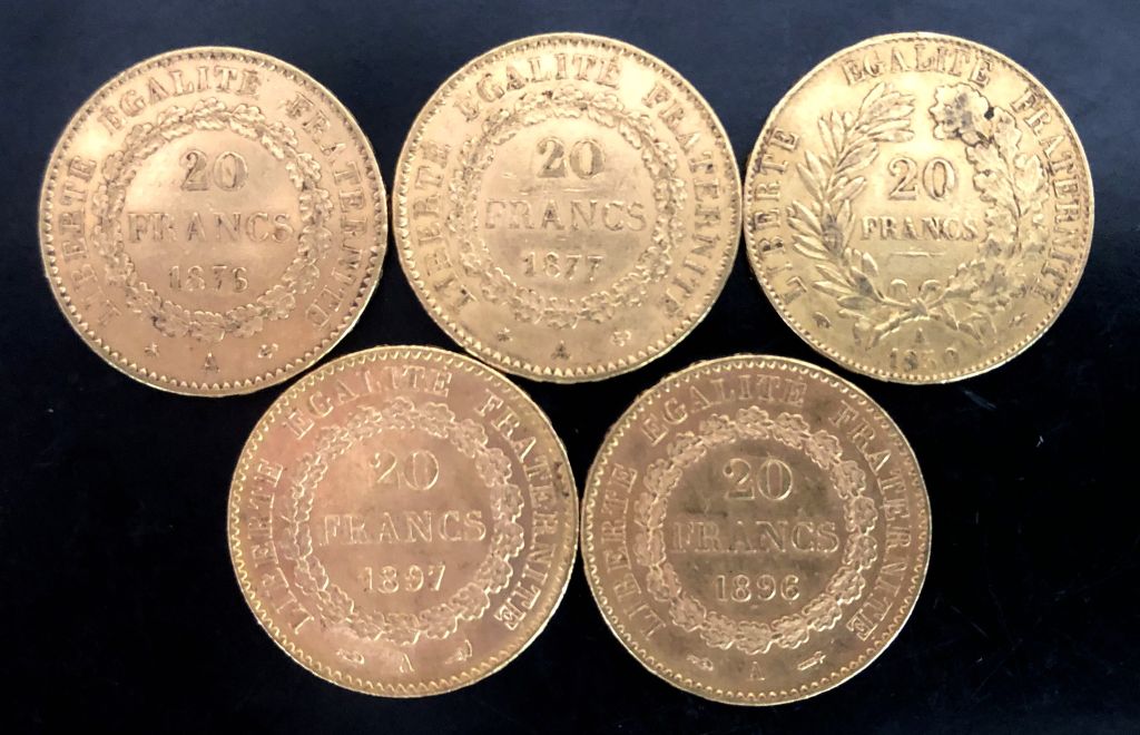 Cinq pièces de 20 Francs or, 1850-A, 1876-A, 1877-A, 1896-A et 1897-A. FRAIS ACHETEURS 5% TTC.