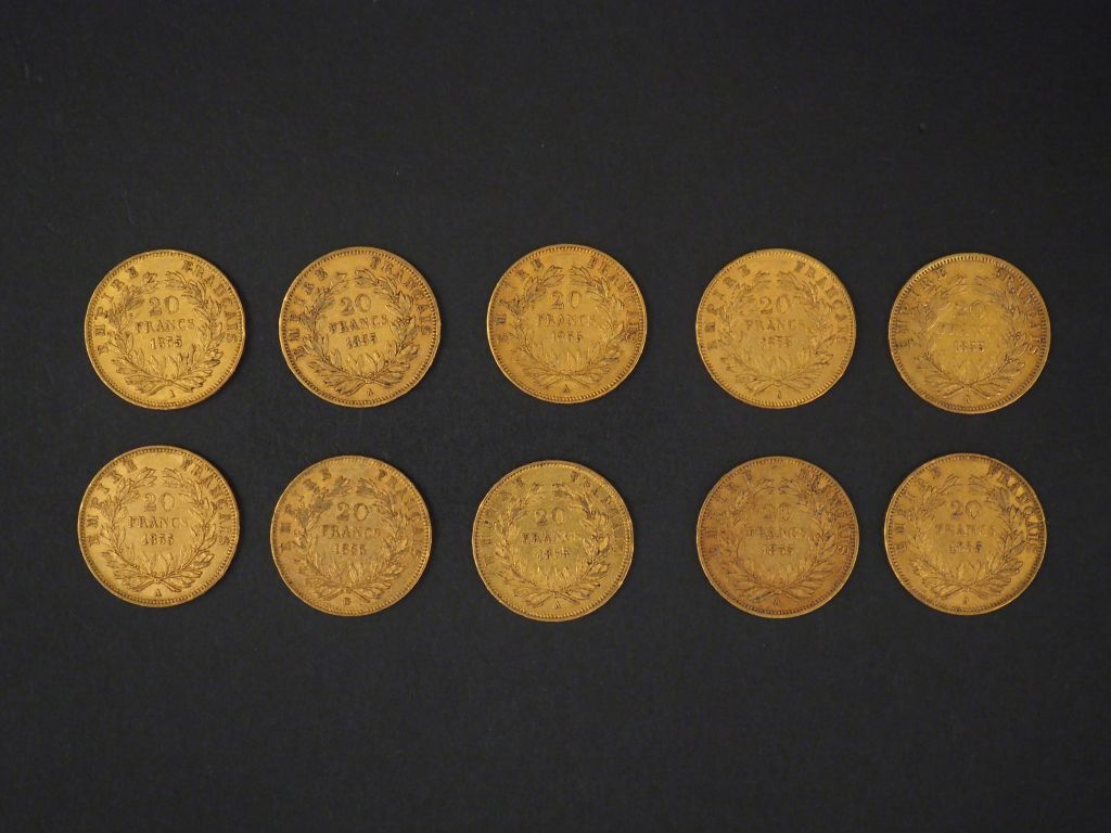 Dix pièces de 20 Francs or, 1855-A (x9) et 1855-BB. FRAIS ACHETEURS 5% TTC.