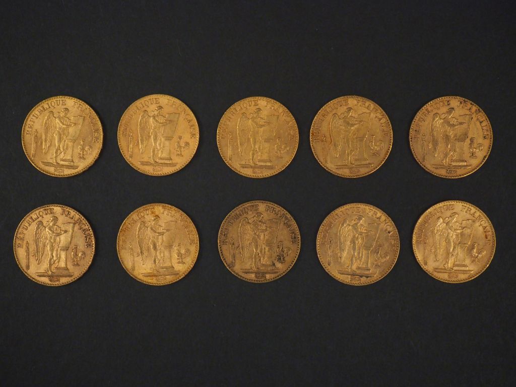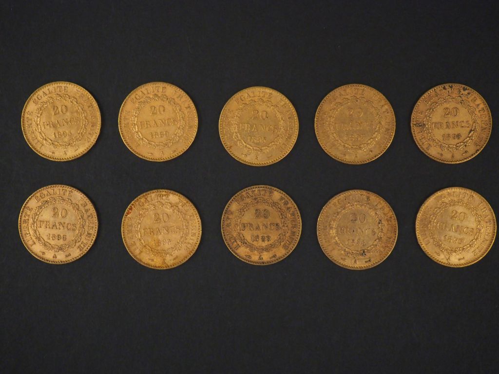Dix pièces de 20 Francs or, 1889-A (x2), 1893-A, 1895-A (x5), 1896-A et 1897-A. FRAIS ACHETEURS 5% TTC.