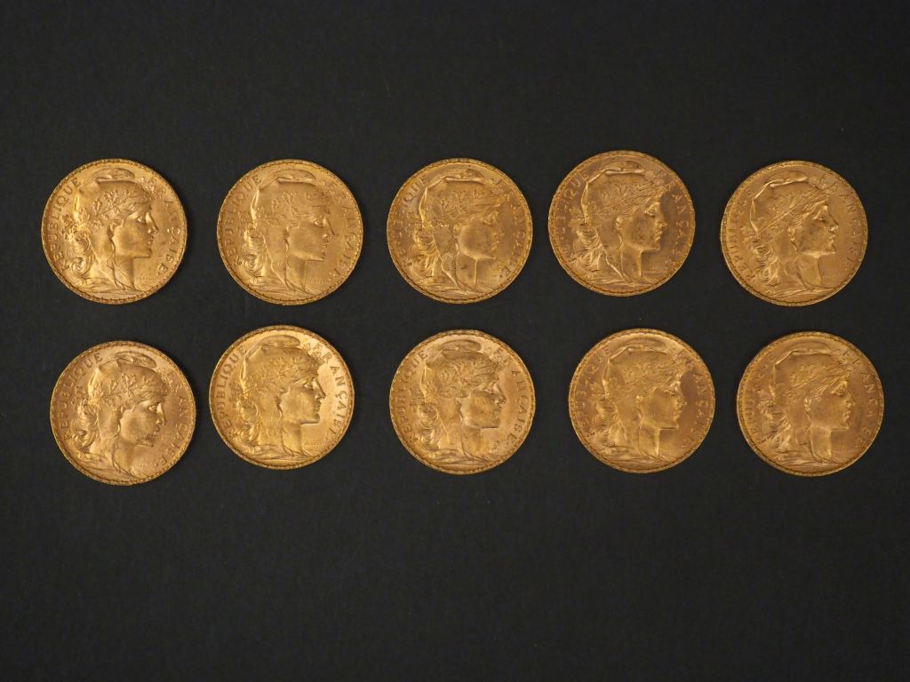 Lot de Dix pièces de 20 Francs or, 1907. FRAIS ACHETEURS 5% TTC. au prix de à € en vente aux enchères par l'hôtel des ventes Primardeco