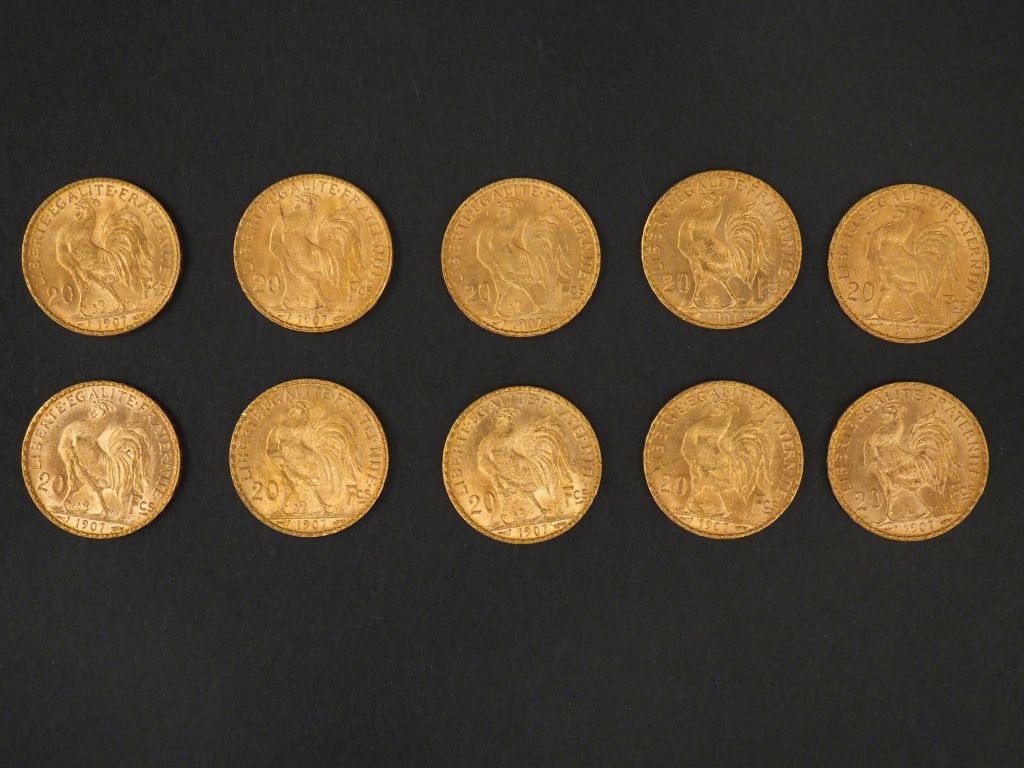 Dix pièces de 20 Francs or, 1907. FRAIS ACHETEURS 5% TTC.