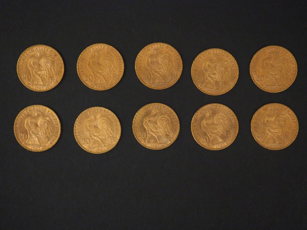 Dix pièces de 20 Francs or, 1907. FRAIS ACHETEURS 5% TTC.