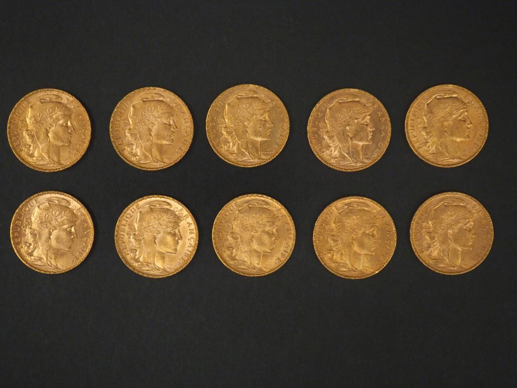 Lot de Dix pièces de 20 Francs or, 1907. FRAIS ACHETEURS 5% TTC. au prix de à € en vente aux enchères par l'hôtel des ventes Primardeco