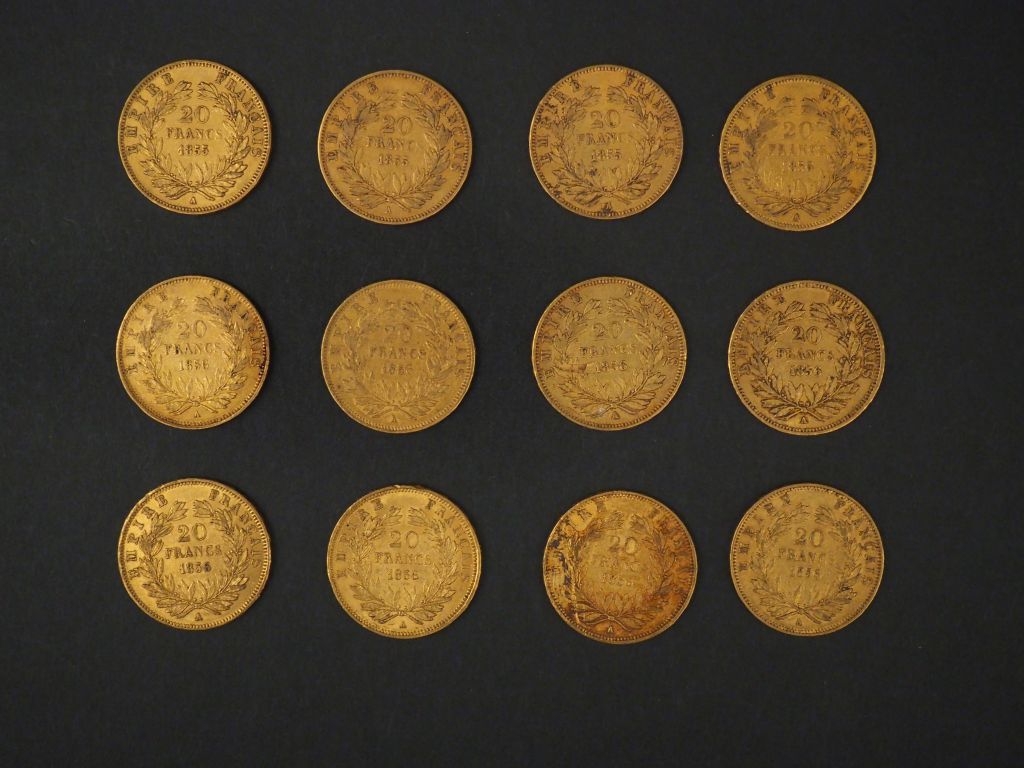 Douze pièces de 20 Francs or, 1855-A (x3) et 1856-A (x9). FRAIS ACHETEURS 5% TTC.