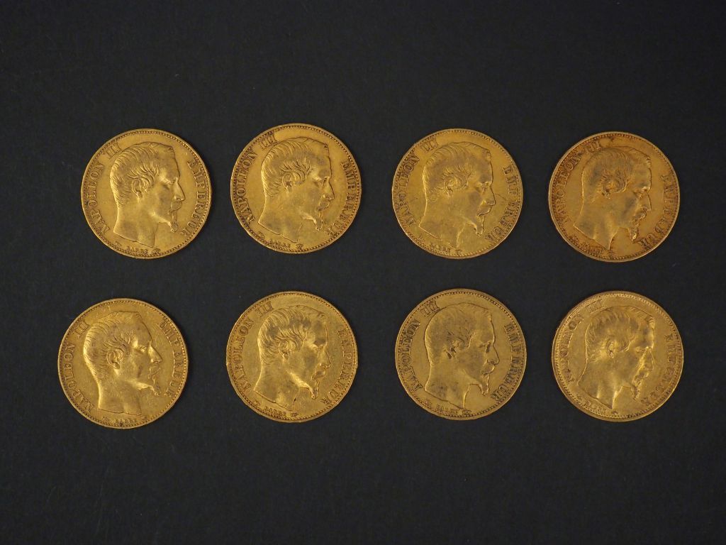 Huit pièces de 20 Francs or, 1853-A (x3) et 1854-A (x5). FRAIS ACHETEURS 5% TTC.