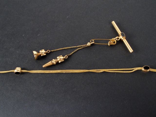 Nécessaire de montre en or et onyx comprenant une giletière et une broche accompagnée de 3 clés ou remontoirs. Poids tel: 16,4gr