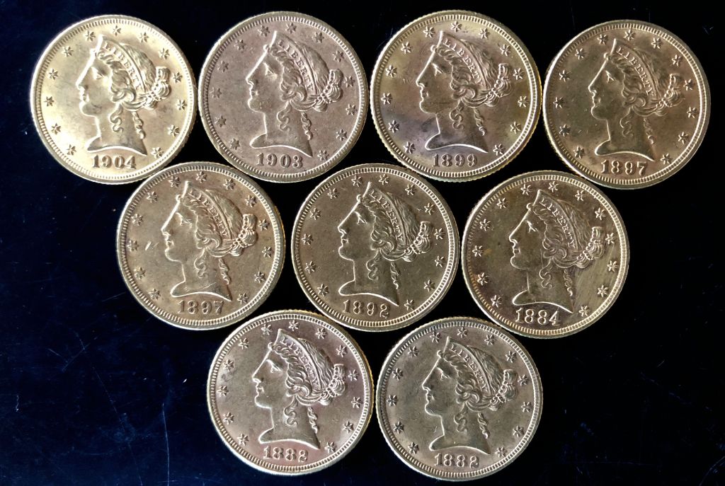 Neuf pièces de 5 Dollars or, 1882 (x2), 1884, 1892, 1897 (x2), 1899, 1903 et 1904. FRAIS ACHETEURS 5% TTC.