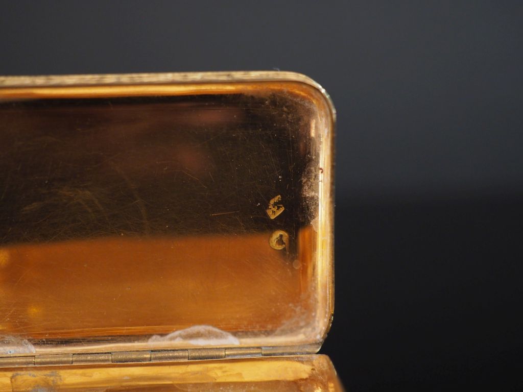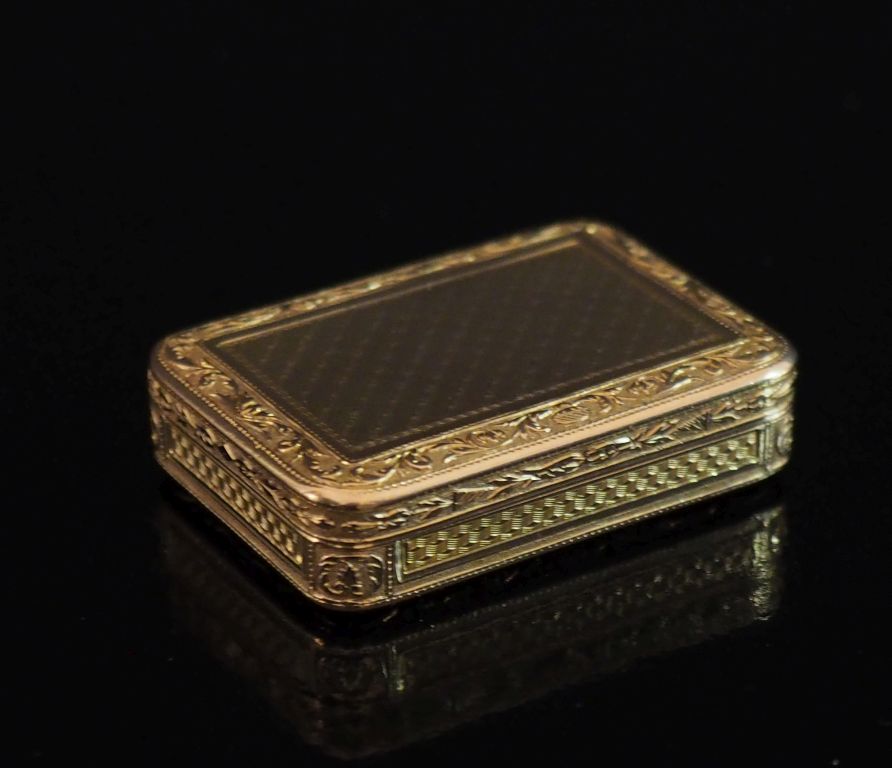 Petite boite à pilule en or jaune 750, à décor quadrillé au centre des faces et de rinceaux feuillagés sur les bordures. 1,4 x 5,1 x 3,7 cm Poids. 38,25 g