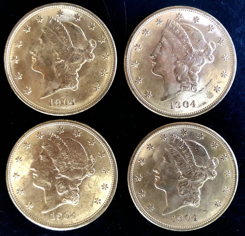 Quatre pièces de 20 Dollars or, 1904. FRAIS ACHETEURS 5% TTC.