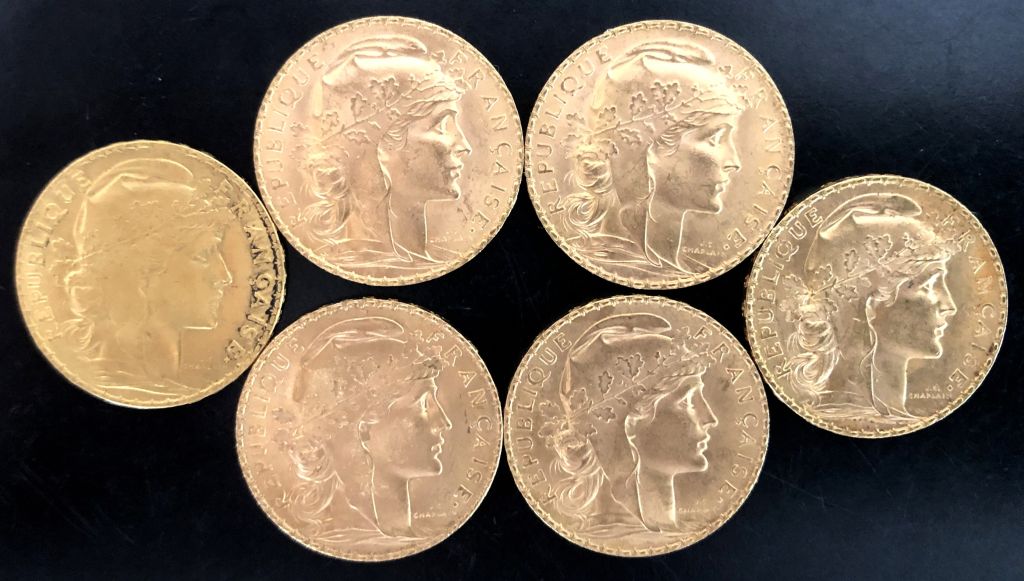 Six pièces de 20 Francs or, 1910 (x2), 1912 (x3) et 1913. FRAIS ACHETEURS 5% TTC.