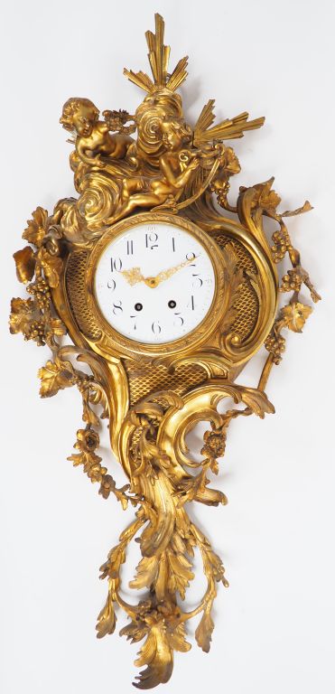 Cartel Napoléon III de style Louis XV en bronze doré à décor d'amours, de pampres, de guirlandes fleurs et de feuillage. Cadran émaillé H. 100 cm