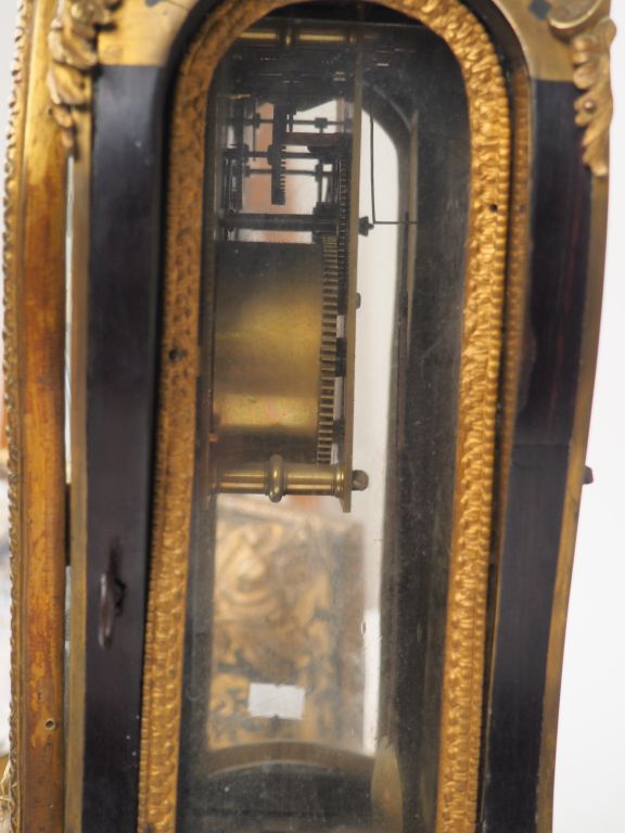 Cartel Napoléon III de style Louis XV en marqueterie Boulle, avec son support, cadran signé Joseph Bertrand à Paris, en partie émaillé, chiffres des minutes. (restauré).
