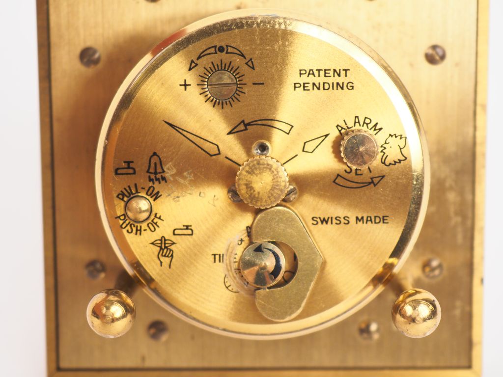 CARTIER. Réveil en laiton et Lapis-lazuli à décor d'une frise de perles. Signé. Dim. 7,5 x 7,5 cm.