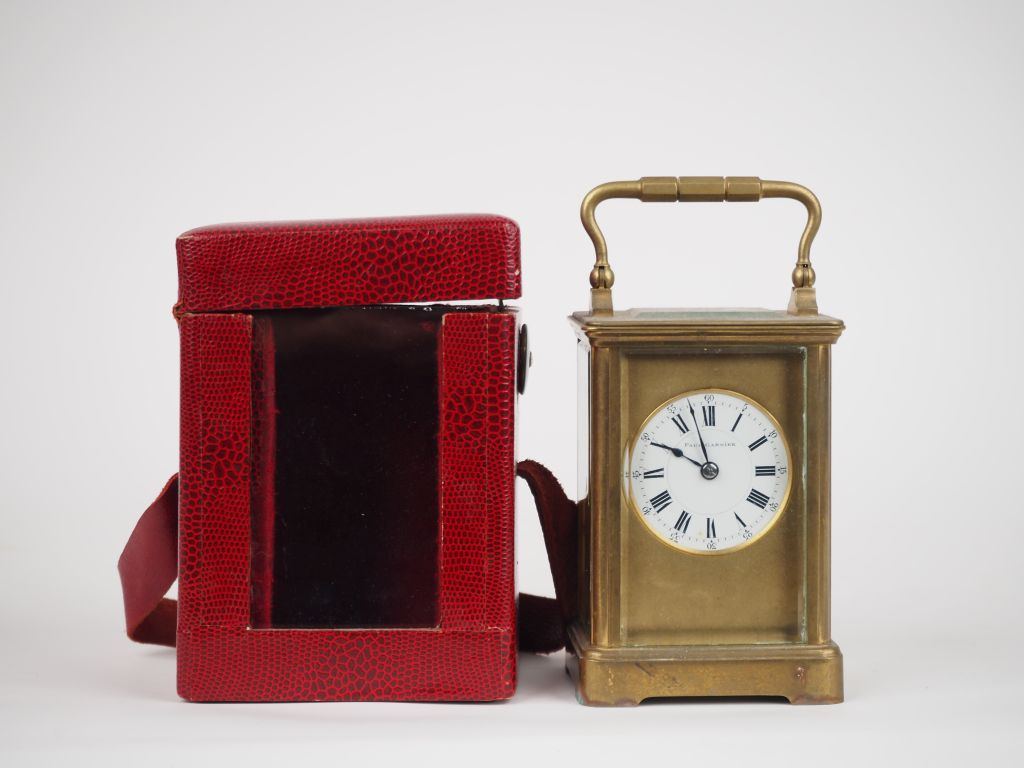 Dans son écrin en cuir rouge, pendulette de voyage en bronze et cristal signé Paul Garnier (bel état), avec sa clé.