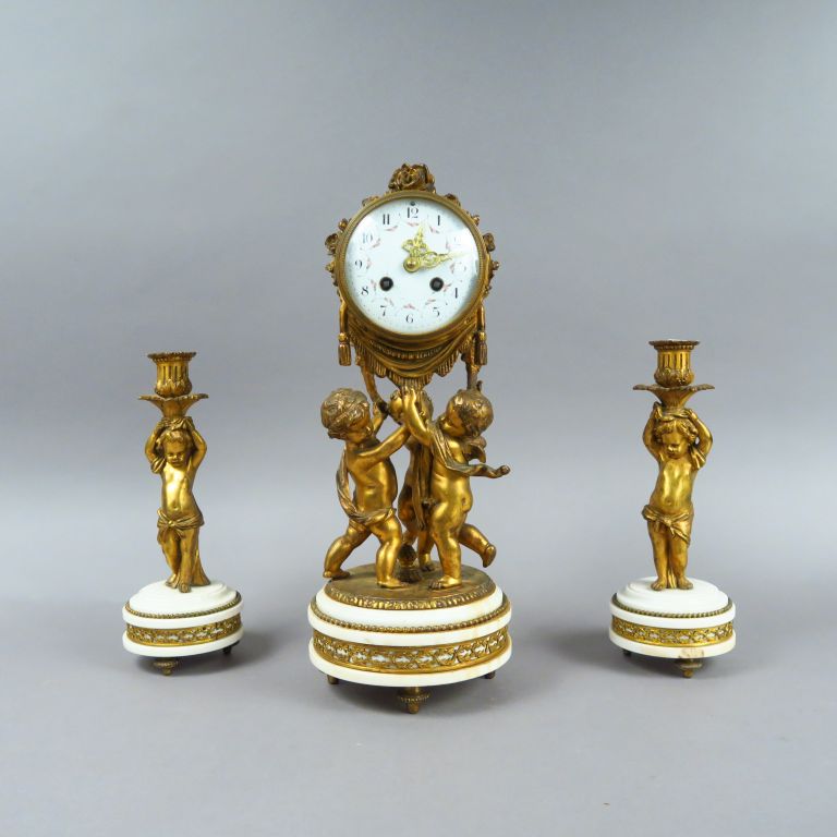 Garniture 1900 de style Louis XVI en marbre blanc et régule à décor d'amours. H. : 42 cm.