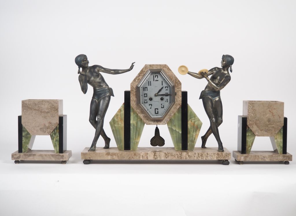Garniture de cheminée de style Art Déco en régule, marbre bicolore et onyx vert à décor de danseuses. Comprenant: - Une pendule, Cadran signé "Gau à Capestang". - Deux vases. Dim. (pendule) 36 x 49 x 13 cm. H. (vases) : 21cm.