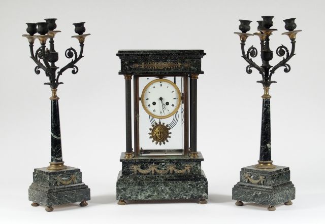 Garniture de cheminée de style Louis XVI en marbre vert, bronze et laiton, comprenant une pendule portique cage et une paire de candélabres éclairant à 4 lumières (égrenure au marbre d'un des candélabre). H. des candélabres : 53,5 cm H. de la pendule : 44 cm