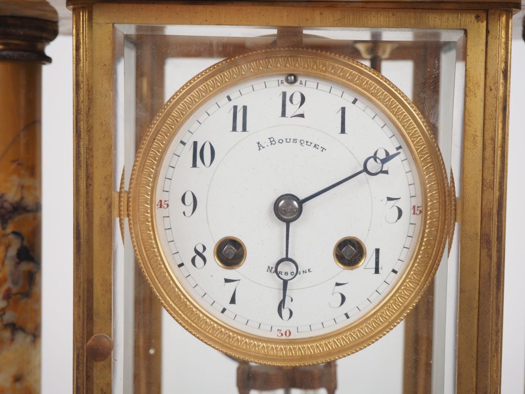 Garniture de cheminée en marbre et laiton comprenant une pendule portique surmontée d'un lion et une paire de cassolettes en forme d'amphore. H. de la pendule : 38 cm H. des cassolettes : 30 cm
