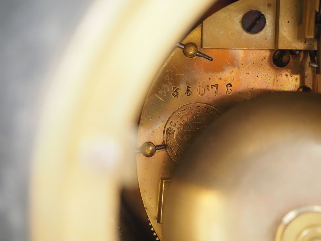 Garniture de cheminée Napoléon III en bronze et marbre vert. Comprenant: - Une pendule borne figurant une femme à l'antique, cadran émaillé à chiffres romains signé DETOUCHE à Paris. H. 56 cm. - Paire de vases à décor d'allégories de la musique dans des réserves, de brins de blé et de corbeilles de fruits. H. 34 cm.