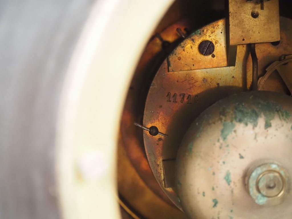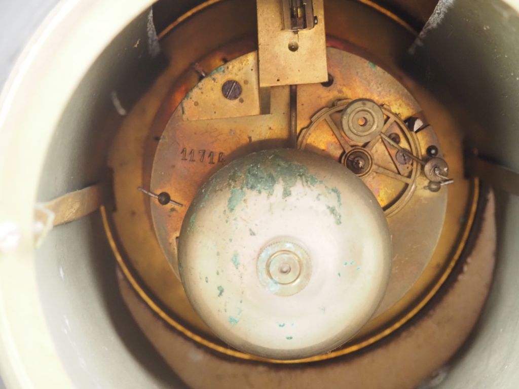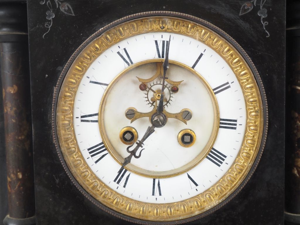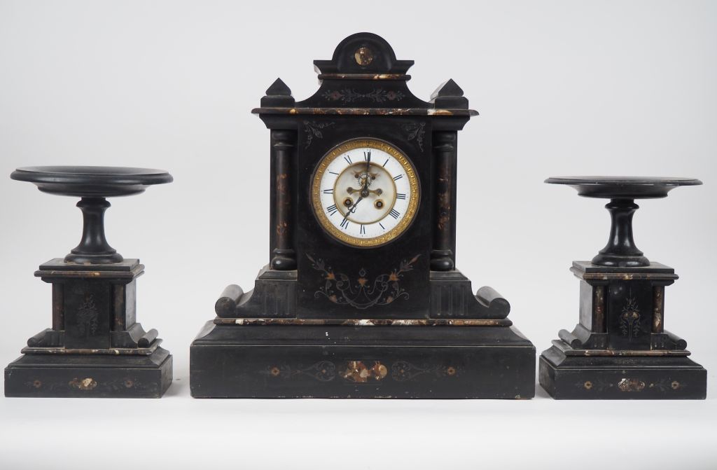 Garniture de cheminée Napoléon III en marbre bicolore. Comprenant: - une pendule borne cadran émaillé à chiffres romains. Dim. 47 x 45,5 x 19 cm. - une paire de cassolettes. H. 29,5 cm.