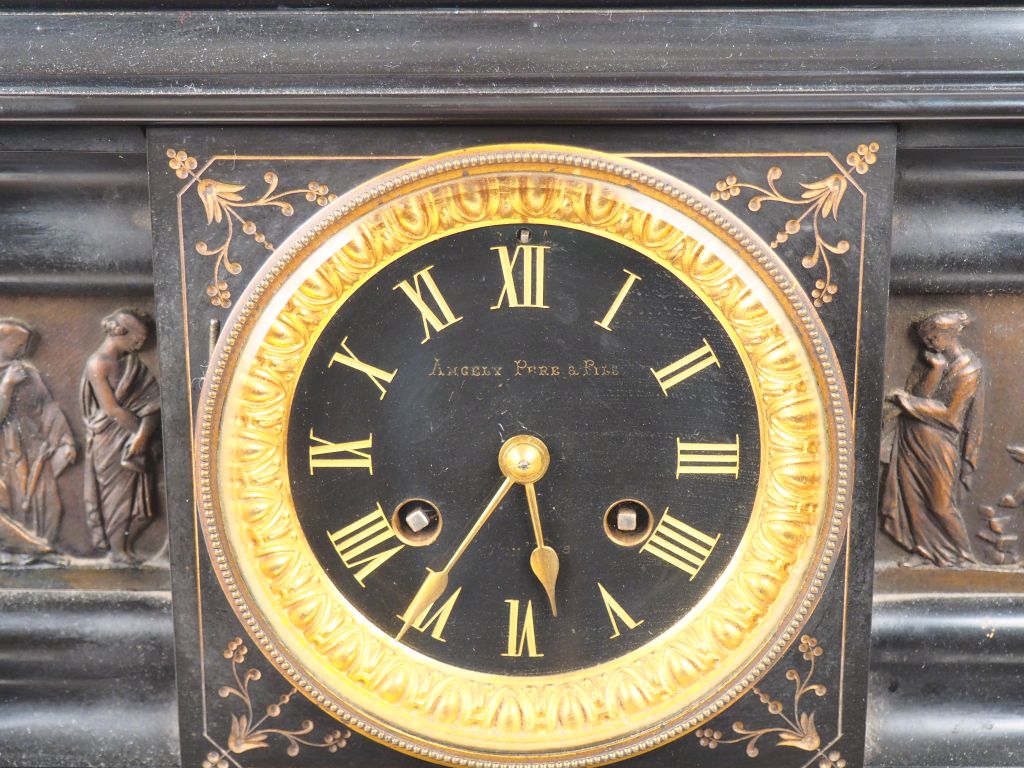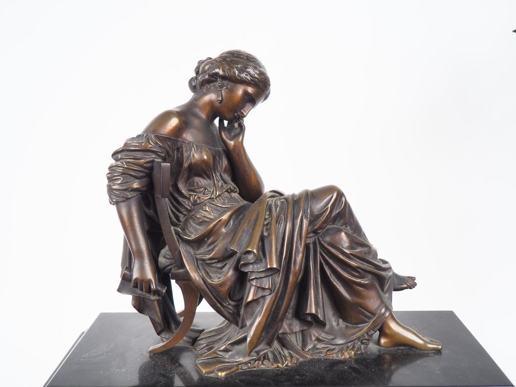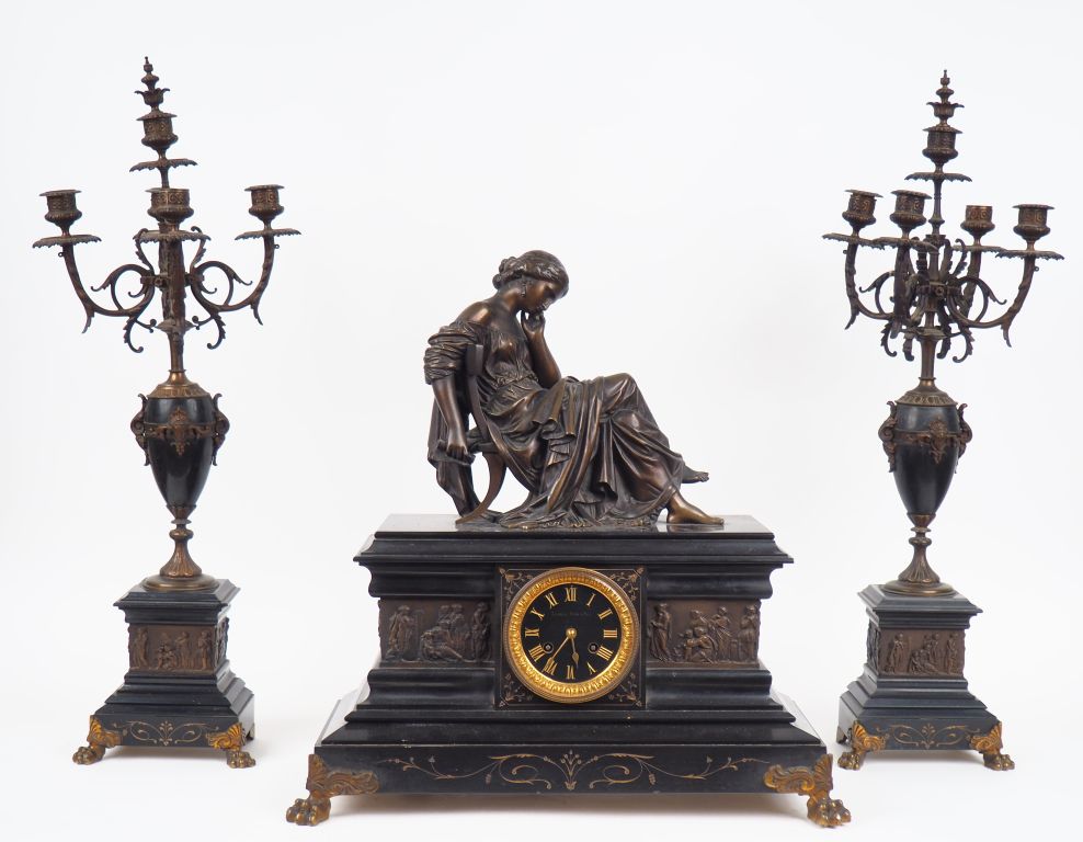 Garniture de cheminée Napoléon III en marbre noir et bronze, la pendule surmontée d'un sujet en bronze d'après James Pradier. H des candélabres à cinq lumières : 71 cm Dim. Pendule : 53 x 48 x 24 cm