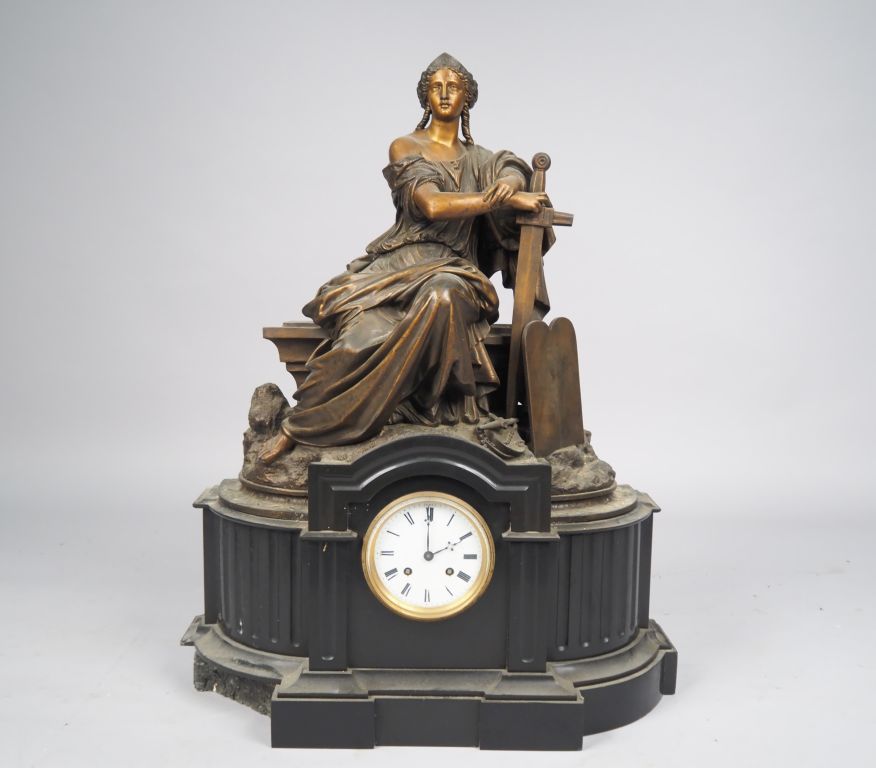 Grande pendule de cheminée Napoléon III en marbre noir et régule à patine brune figurant une allégorie de la justice. Dim. 76 x 60 x 24 cm