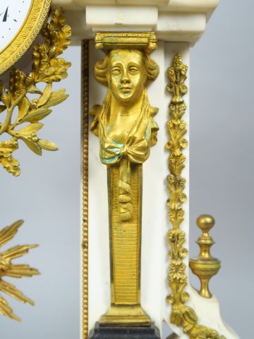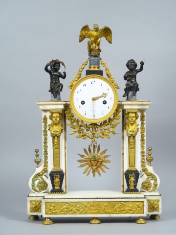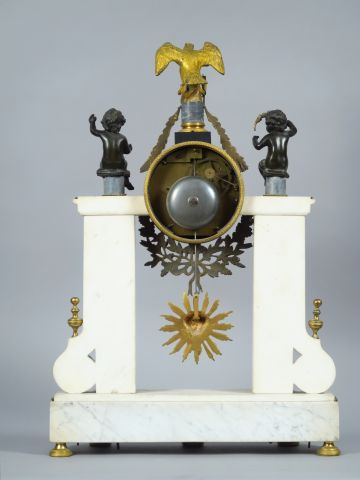 Grande pendule portique début XIX ème en marbre tricolore, bronze patiné et doré, à décor d’aigle, d’amours et de gaines, balancier au soleil (petits manques et petites égrenures). 62 x 42 x 12 cm