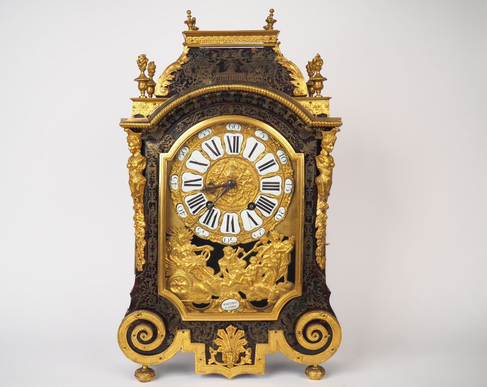 MARTINOT à Paris. Cartel de style Louis XIV en bronze et marqueterie Boulle, ornementation de bronze doré à décor d'espagnolettes, de muffle de lion et d'une composition représentant Hélios sur son char. Chiffres du cadran émaillés. Dim. 61 x 38,5 x 14 cm. (élément à refixer)