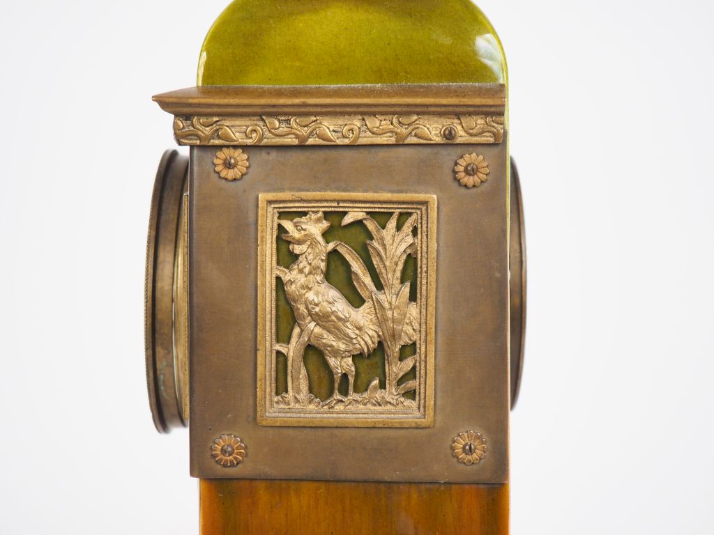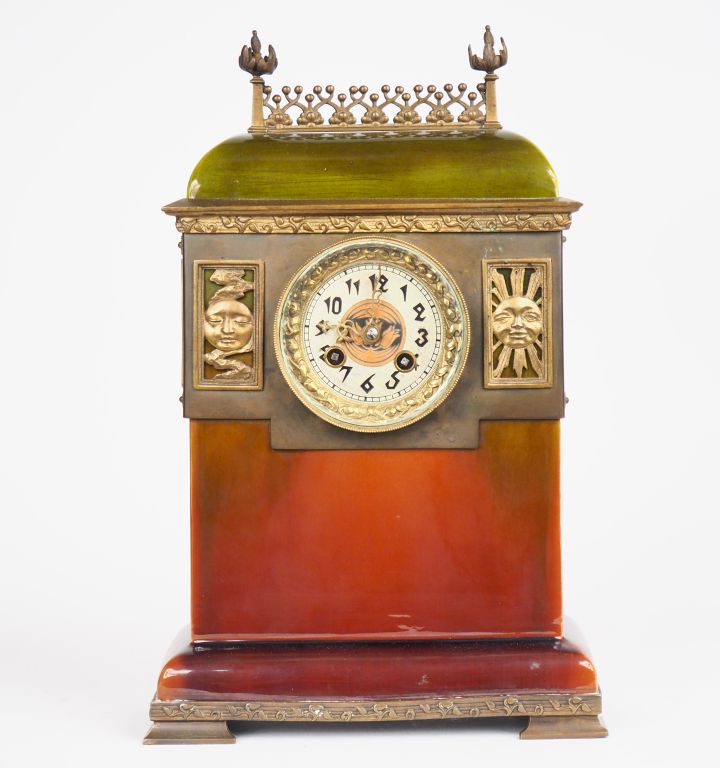 Pendule borne Art Déco en céramique verte et brune, belle ornementation de bronze à décor allégorique. Dim. 40 x 25,5 x 13 cm