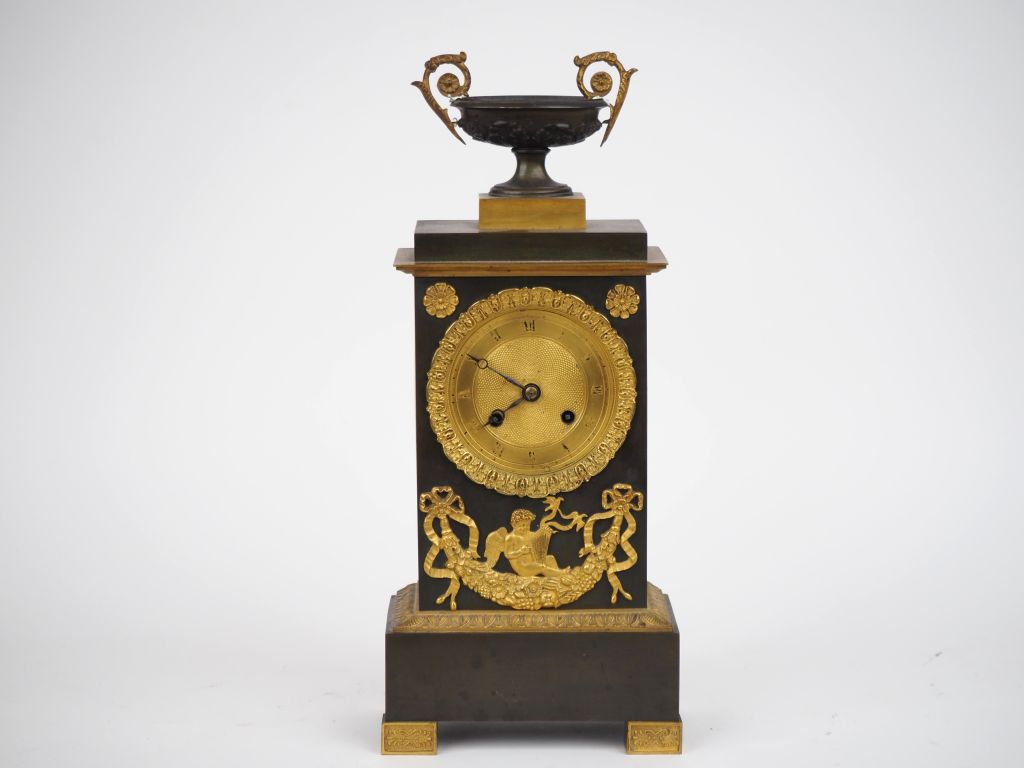 Pendule borne Restauration en bronze patiné et doré, à décor d'amours musiciens, de guirlandes de fleurs et de nœud de rubans, surmontée d'un vase à l'antique à anses (anses accidentées) Dim. 33,5 x 9 x 15 cm