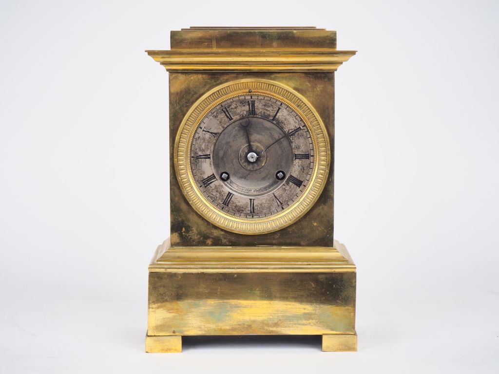 Pendule borne XIXème en bronze, à décor de rais de cœur et de perles, cadran signé Bellion. Dim. 28,5 x 18 x 12 cm.