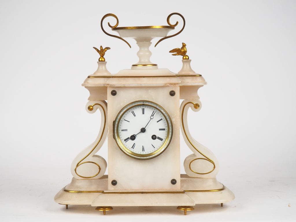 Pendule borne XXème en albâtre et laiton à décor de deux colombes, cadran émaillé, mécanisme signé JPD à Paris. Dim. 35,5 x 32 x 14 cm. (accidents)