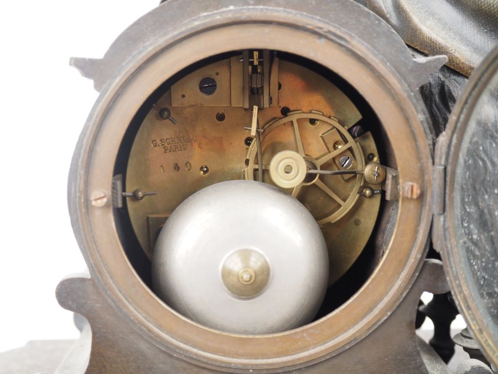 Pendule en bronze Napoléon III figurant une bacchanale sur un socle en bois polychrome rapporté. Cadran émaillé signé G. SCHMOLL à Paris. Dim. 43 x 52 x 17 cm.