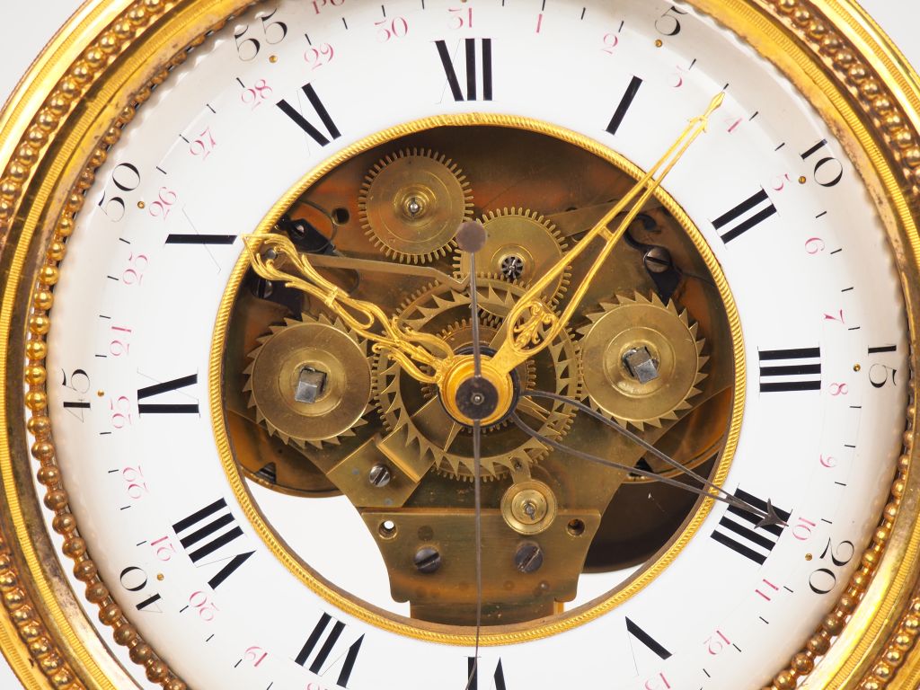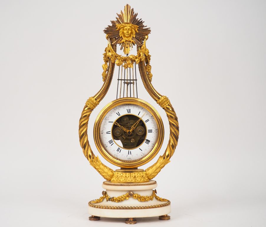 Pendule lyre Louis XVI en bronze ciselé, doré et marbre blanc, à décor de rangs de perles, de pampres, de côtes torses et de mascaron. Echappement à cheville. Cadran en partie émaillé et squelette. Sous une cage en verre. H 56.5 cm