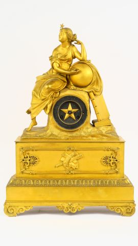 Pendule Restauration en bronze doré, à décor d'une allégorie de la géographie. H. : 47,5 cm