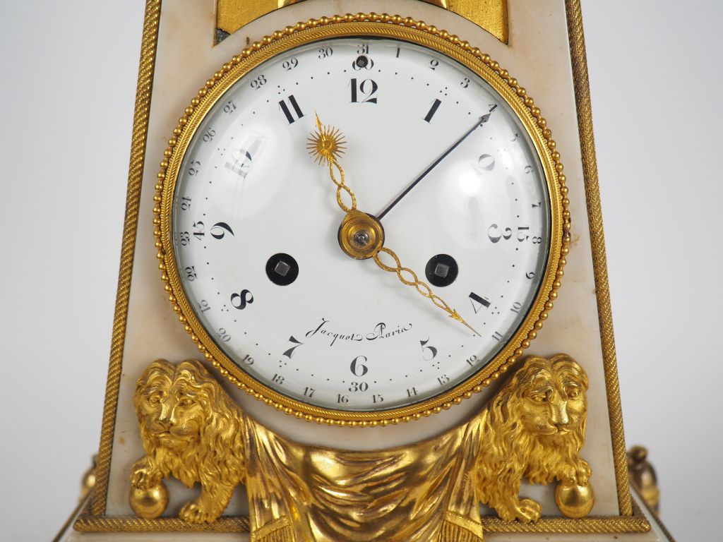 Superbe pendule fin XVIIIème début XIXème en forme d'obélisque en marbre blanc et bronze ciselé et doré, à décor de nymphes portant le monde, de Cupidon, de lions, de draperie, d'attributs guerriers et d'une sphère armillaire. Cadran émaillé signé Jacquot à Paris. La base en marbre noir. H. 75 x 32 x 19,5 cm