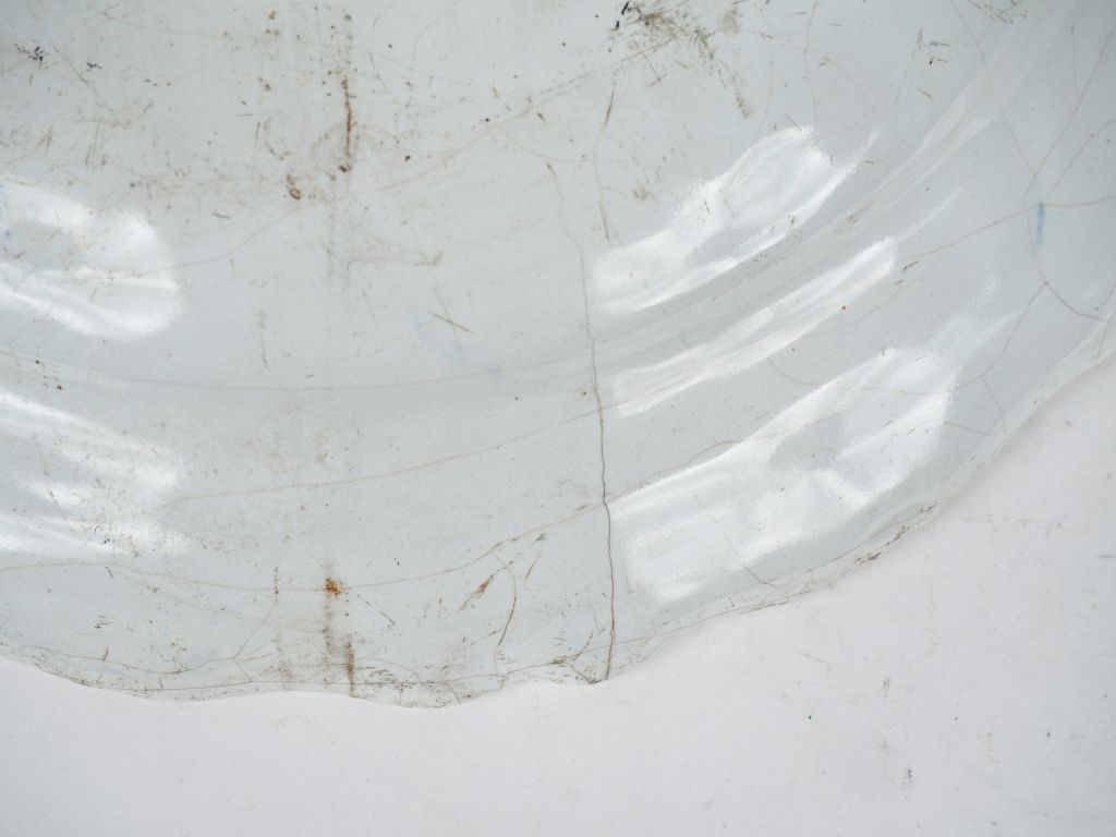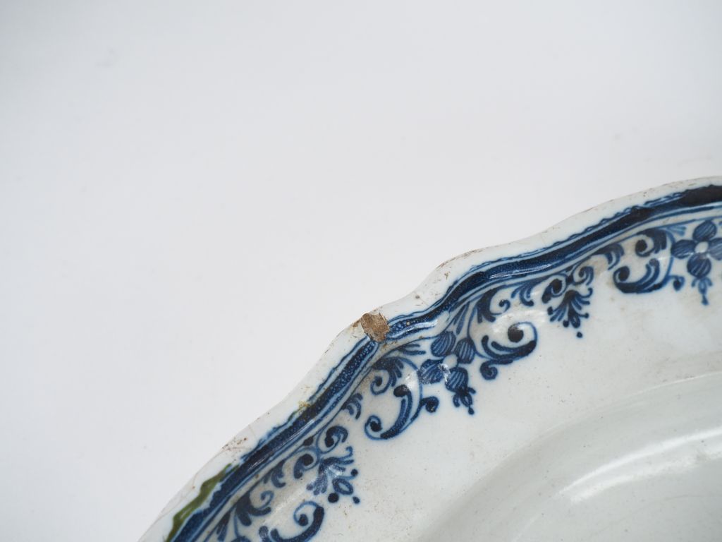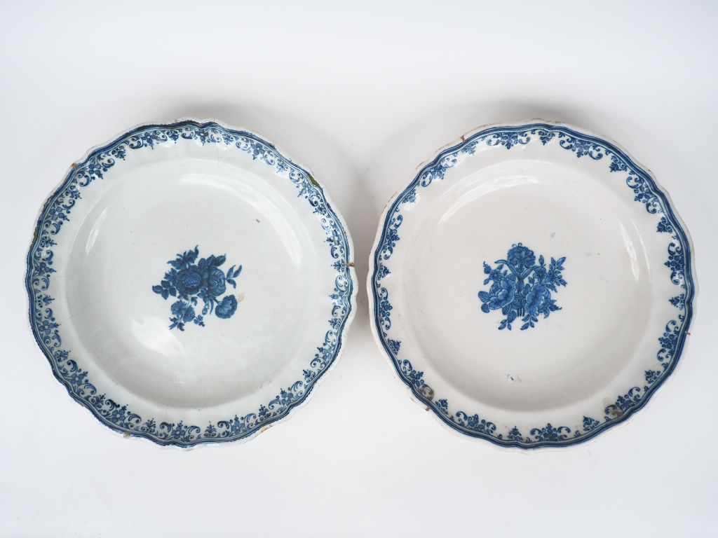 2 grands plats ronds XVIIIème en faience du Midi, décor de fleurs en camaieu bleu. Diam. 35,5 et 35 cm (fels et égrenures)