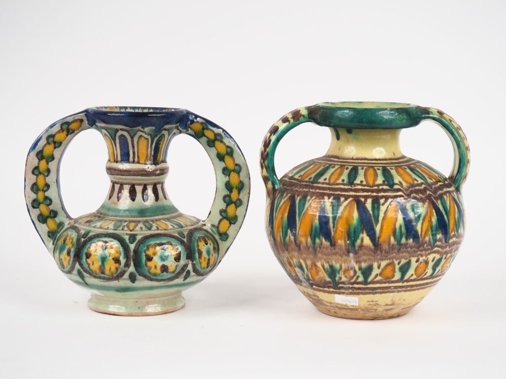 Lot de 2 vases à anses en faience du Maroc Signés H. 20,5 cm - H. 19,5 cm au prix de 50 à 80 € en vente aux enchères par l'hôtel des ventes Primardeco